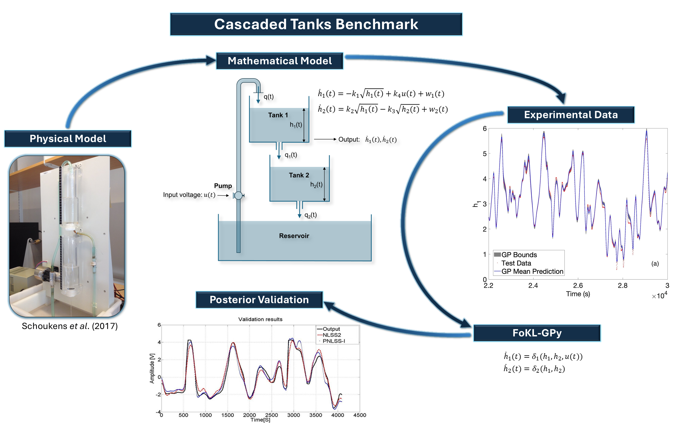 This figure illustrates the hybrid modeling process using the cascaded tanks benchmark, a standard testbed in system