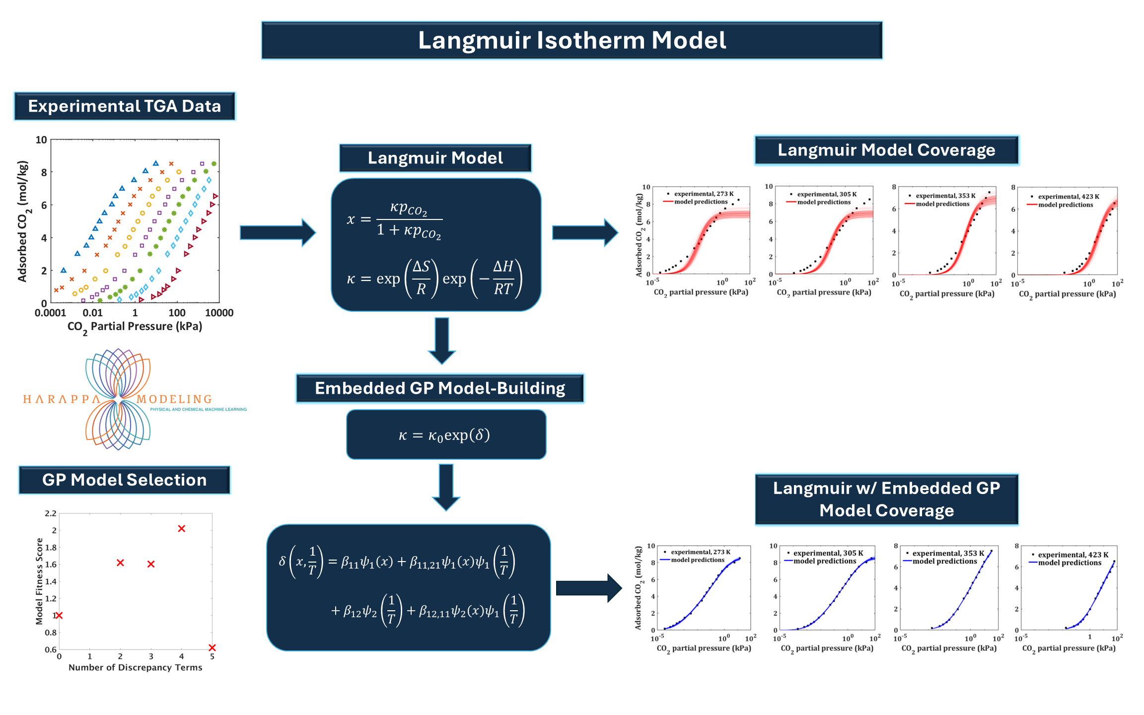 This schematic illustrates a modeling approach that augments the classical Langmuir isotherm with Gaussian Process (GP)
