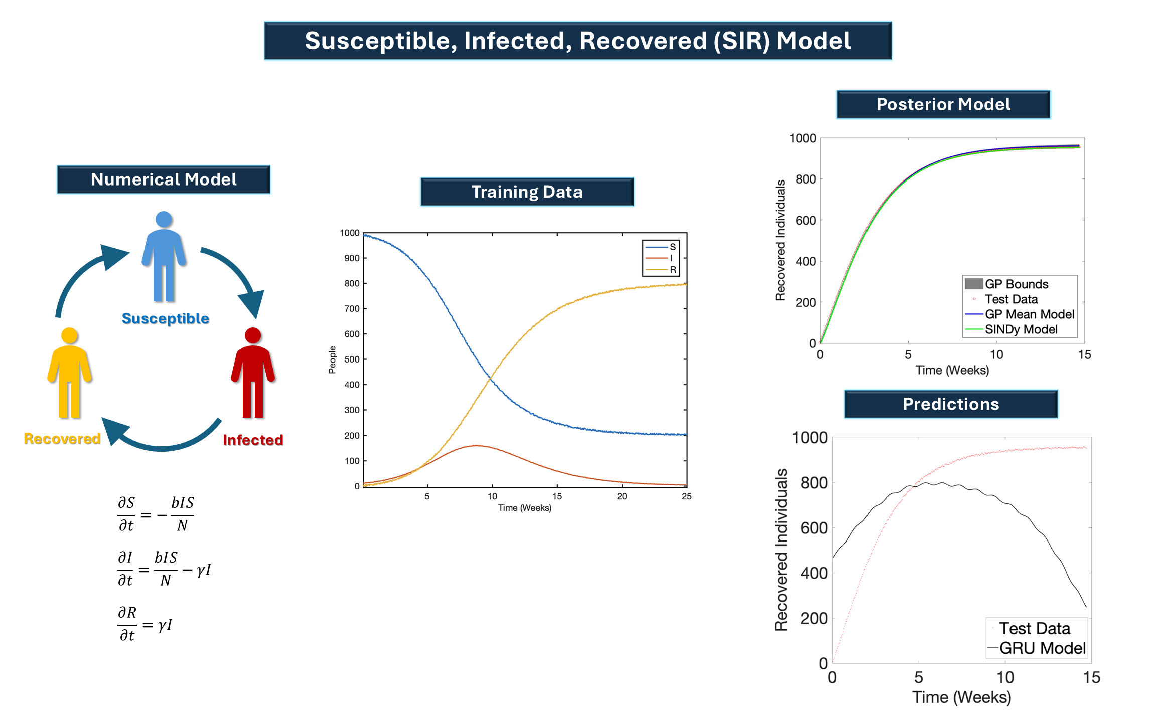This figure presents a hybrid modeling framework using the classical SIR epidemiological model, enriched with machine